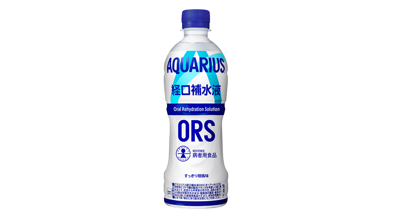 アクエリアス経口補水液ORS(オーアールエス)は、電解質とブドウ糖の配合バランスを考慮した経口補水液です。軽度から中等度の熱中症、過度の発汗による脱水状態の方が水分・電解質の補給・維持をするのに適した病者用食品です。また、感染性胃腸炎による下痢・嘔吐に伴う脱水状態にもご利用ください。