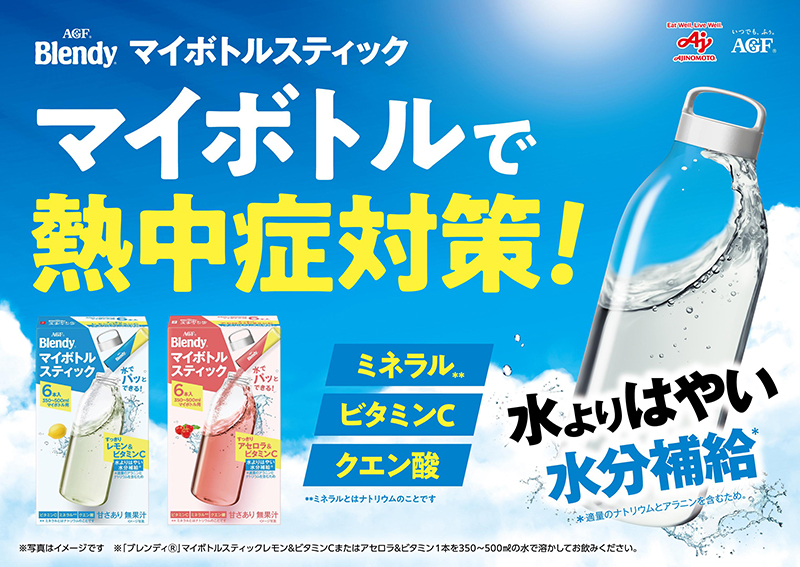 「ブレンディ®」 マイボトルスティック すっきりレモン&ビタミンC、すっきりアセロラ&ビタミンCは、熱中症対策に大切な水分と塩分が一緒に摂取できる、マイボトル用ドリンクです。