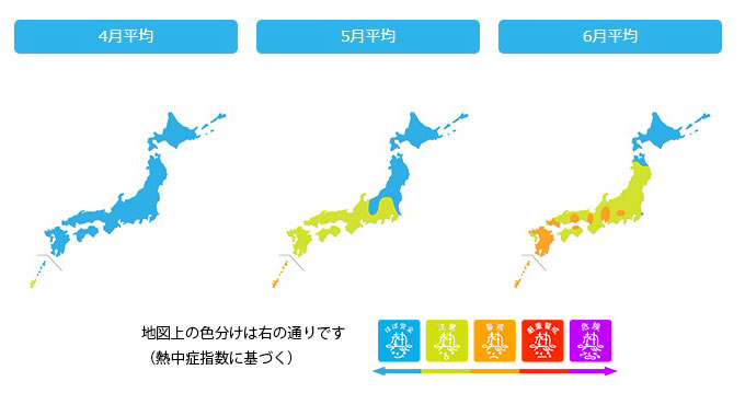 こちらは、3/25時点の情報をもとに、日本気象協会が4月~6月の3ヶ月間の気温傾向および熱中症傾向についてわかりやすくまとめたものです。