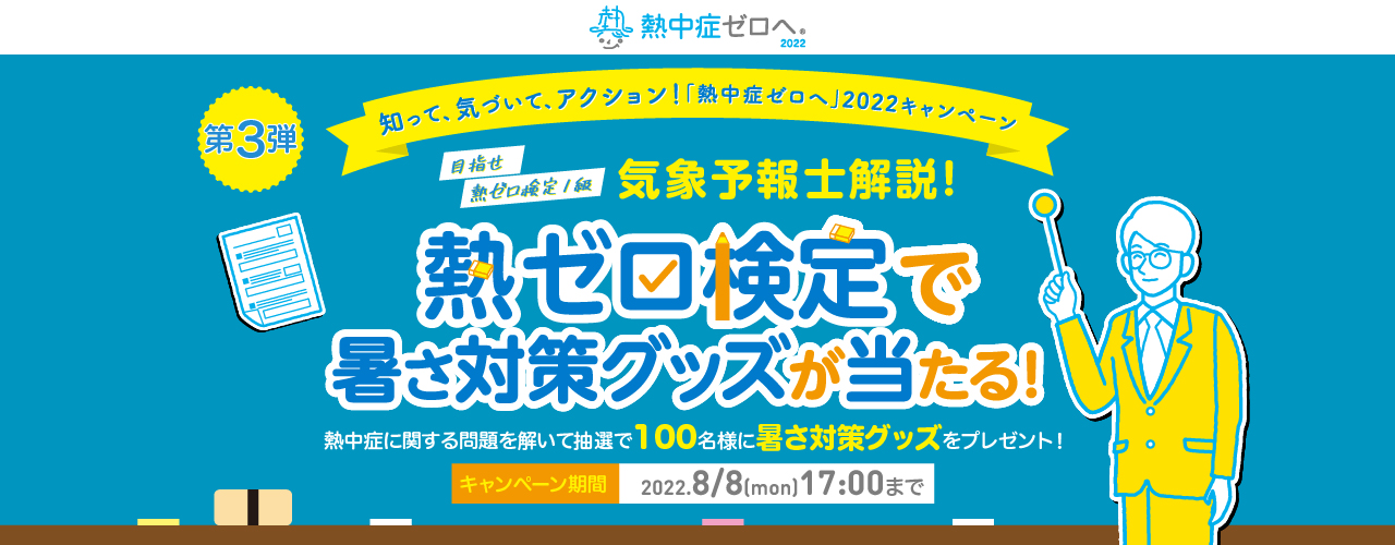 「知って、気づいて、アクション!『熱中症ゼロへ』2022キャンペーン」第3弾「熱ゼロ検定で暑さ対策グッズが当たる!」を開始いたしました。